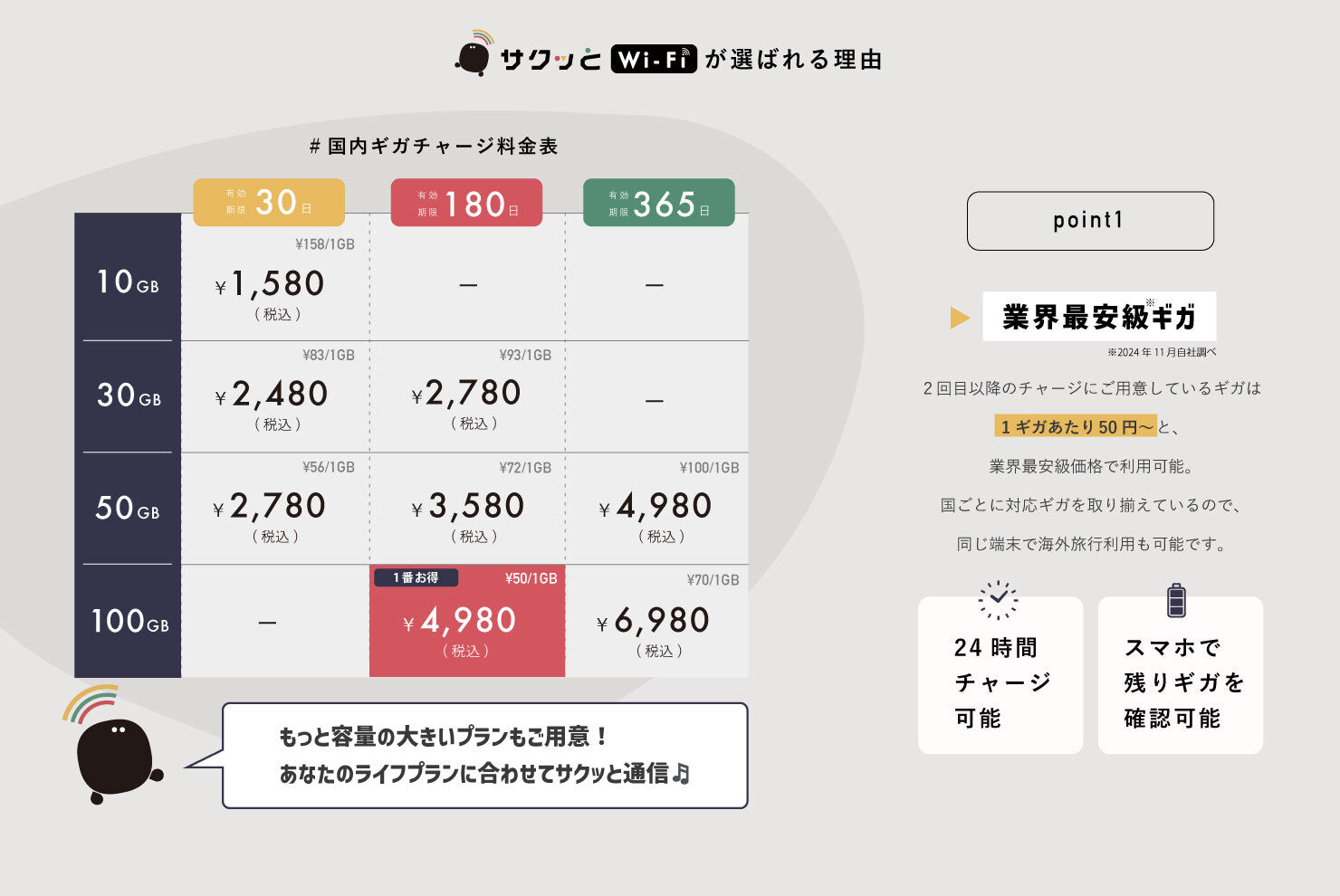 平素よりサクッとWi-Fiをご愛顧いただき、誠にありがとうございます。私たちは昨年12月より “旅も日常も、ストレスなくつながる安心感” をお届けするべく、・自社ECでの販売開始・国内ギガ(追加チャージ)提供・LINEお客様窓口の開設・海外ギガの提供 といったサービス改善を重ねてまいりました。 しかしながら、昨今の 回線卸価格・為替の変動、および 通信品質維持に伴う監視コスト増 により、 やむを得ず ギガチャージ(追加ギガ)の価格を改定 させていただく運びとなりました。 今後の流れ6月23日 価格変更・適用 新しい価格表は以下になります。 何卒よろしくお願いいたします。