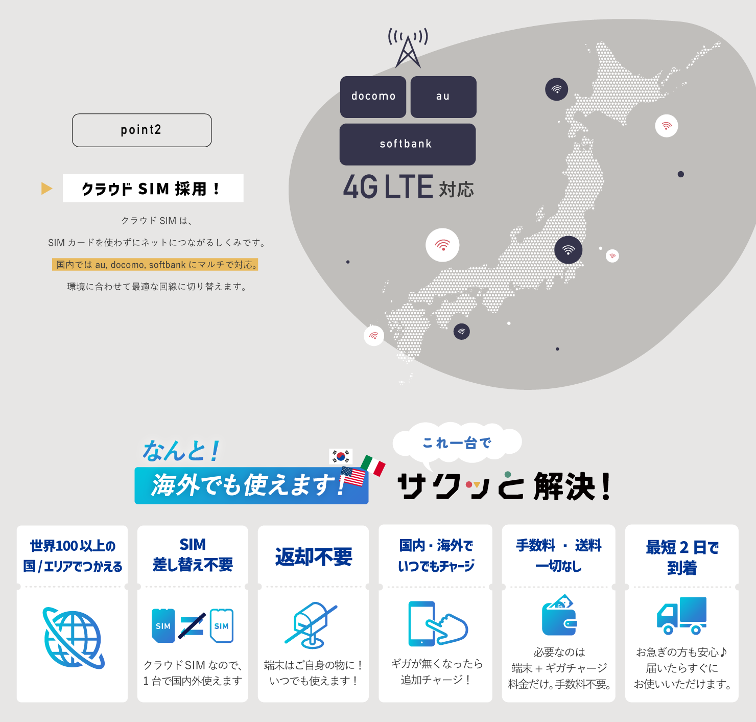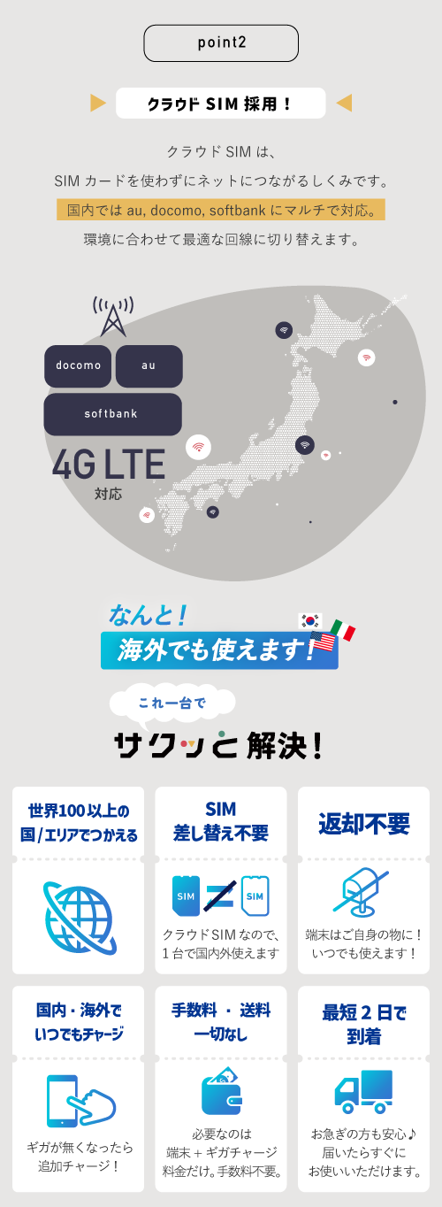 日本国内の大手キャリア(docomo、au、SoftBank)のネットワークに対応していますが、